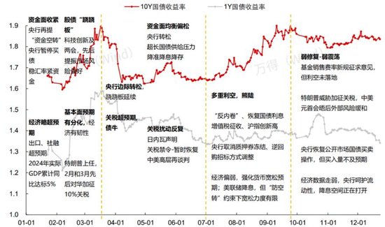 从2025年的回顾来看,债券市场表现并不算强,全年各阶段的交易主题也有所不同。从当前图表可以看到辉煌配资,一季度利率上行较为明显,这主要是因为2024年年底市场对利率宽松、资金宽松政策存在过度定价和提前抢跑的情况,2025年第一季度核心就是修复这一过度抢跑的预期。