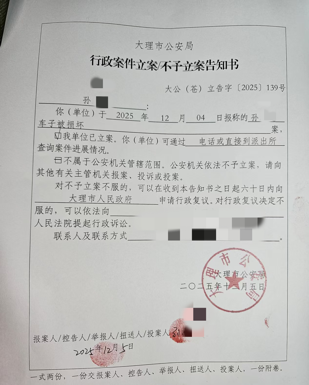 警方立案告知书