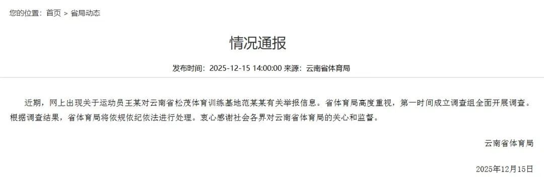 事件发酵后,云南省体育局于12月15日在其官网发布情况通报,称省体育局高度重视,第一时间成立调查组全面开展调查,后续将根据调查结果依规依纪依法进行处理。